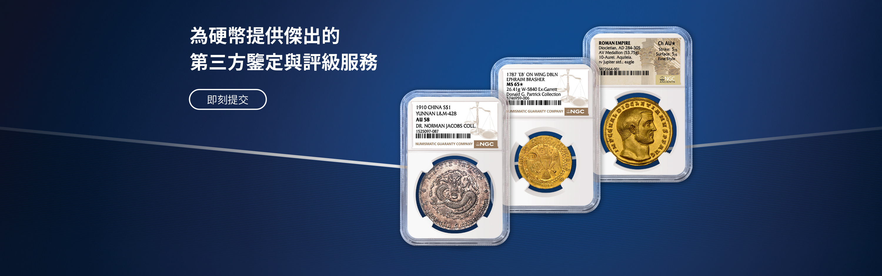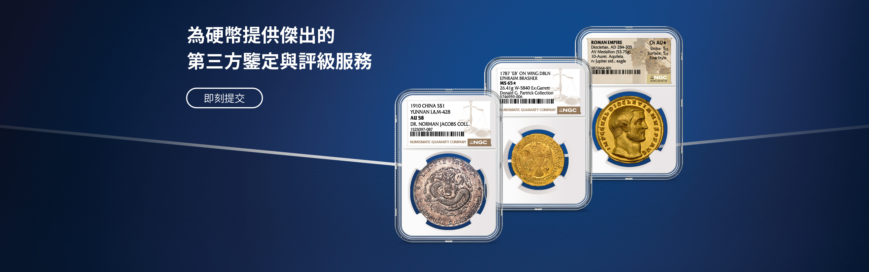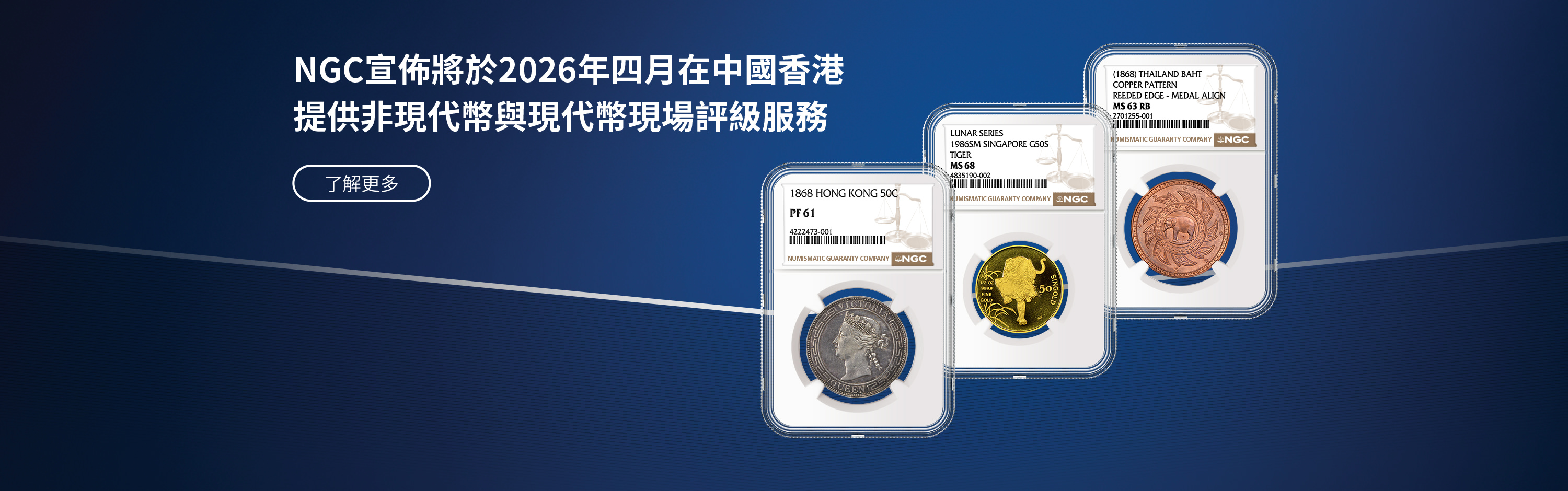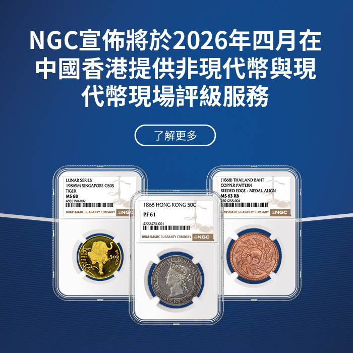 NGC為硬幣、代幣和紀念章提供精準、一致、專業與公正的評級服務。每一件經NGC認證的藏品皆由完善的「NGC保證」為其真實性和評級等級保駕護航,從而給予買賣雙方有效保障。NGC是Certified Collectibles Group(CCG集團)旗下的成員公司,CCG集團致力於通過其服務激發藏家熱情、增添藏品價值及構建收藏社區。