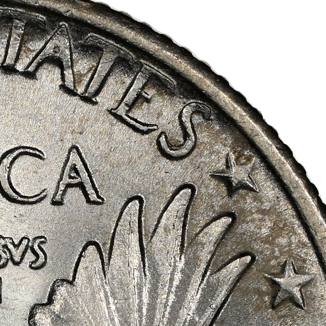 進一步觀察可見,贋品幣正面5點鐘方向近幣緣處的設計師名字首字母“M”幾乎無法辨識;而在贋品幣背面的部分位置,星星和文字融進了幣面,變得模糊不清,在“AMERICA”字樣最後的“A”及其右側正對的一顆星上,這一現象尤為明顯。此外,贋品幣背面飛鷹的羽毛與星星的距離也過近,與真品存在明顯差異。