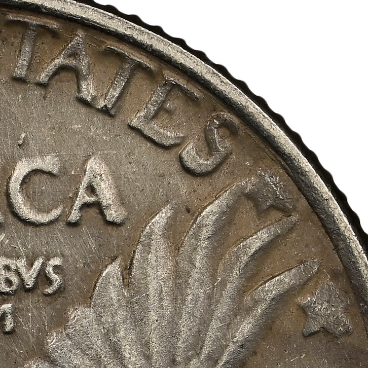 近期,NGC接收了一枚待評級硬幣,據稱為1917年站姿自由女神25美分。幣面未見造幣廠標記,則理論上應是由費城造幣廠鑄造。該幣背面的飛鷹圖案下方有三顆星,這是Type 2的關鍵特徵,也是快速辨別該類別硬幣設計樣式的技巧之一。但轉至正面,幣面盾牌上的鉚釘數量更多、缺失延伸至自由女神頸部的鎖子甲、女神的頭髮飄向頭部左側而非收攏在腦後,這些又都是Type 1的典型特徵,與背面的Type 2特徵相矛盾。