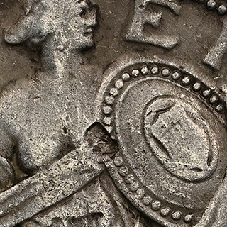 整體來看,該枚贋品幣表面粗糙多孔,正面盾牌左側邊緣處還有明顯缺損。不僅如此,該幣甚至並非採用銀質鑄造。造假者還為其添加人為磨損痕跡,並進行做舊處理,令其呈現出更深沉的色調,以此掩蓋粗糙的偽造工藝水準。