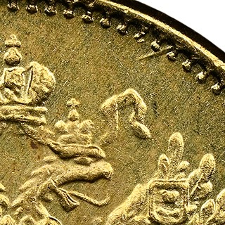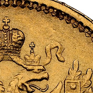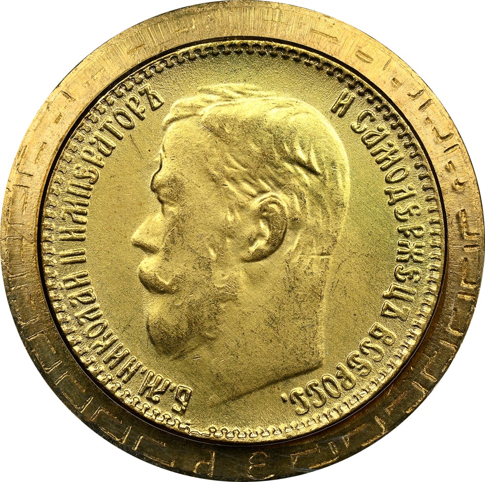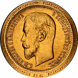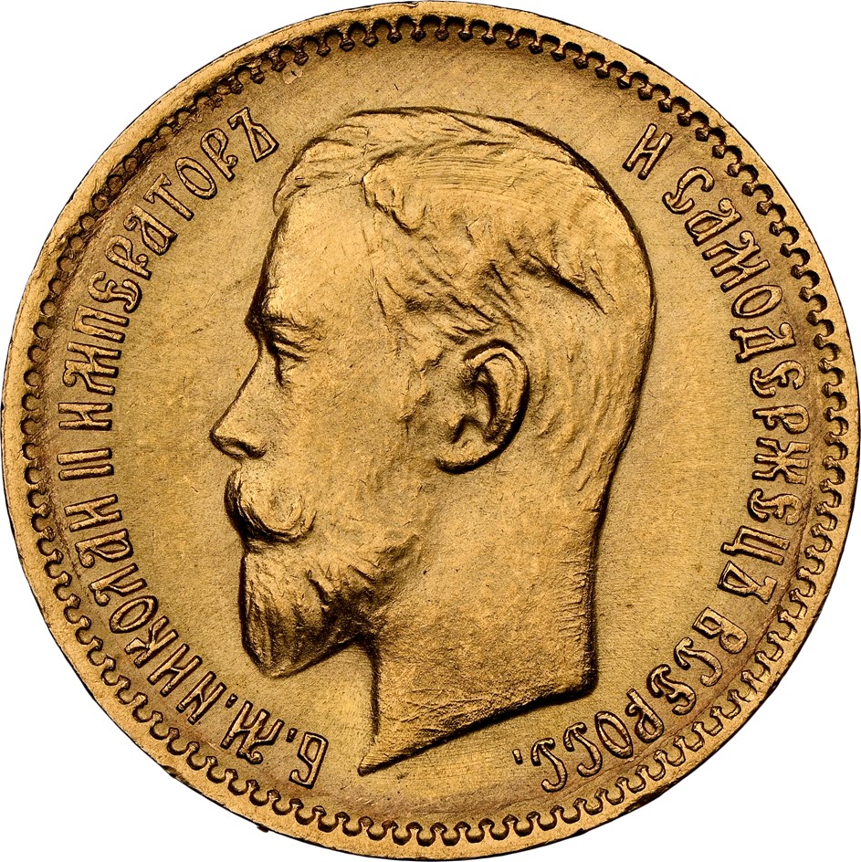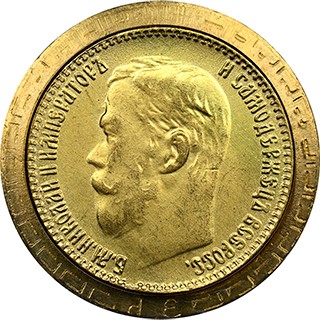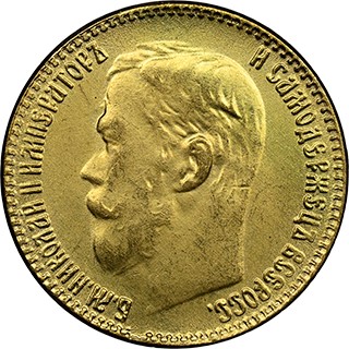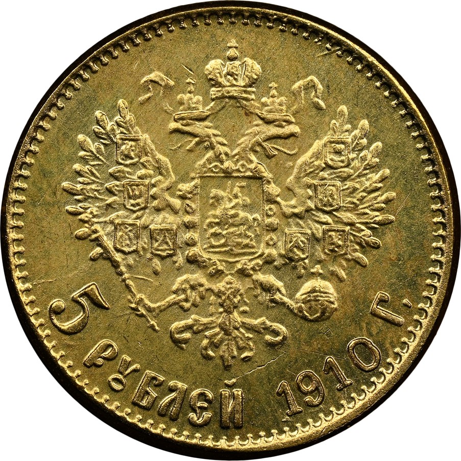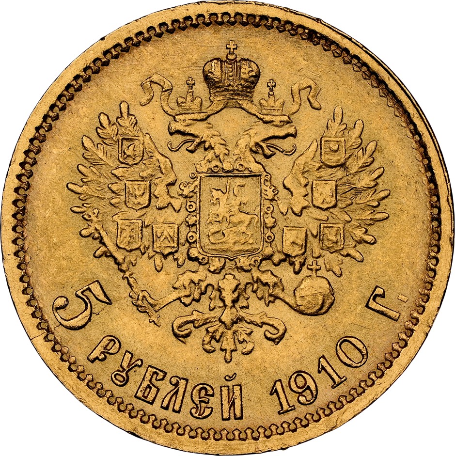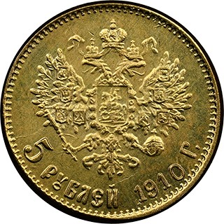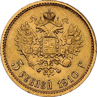 俄羅斯5盧布金幣含金量約為八分之一盎司,直徑僅18毫米,其與10盧布金幣是俄羅斯帝國最後一批發行流通的金幣。1910年及1911年,上述兩種面額金幣的發行量都相對有限,隨後即告停鑄。