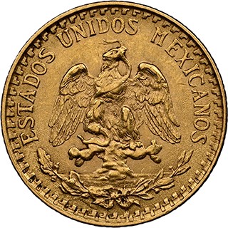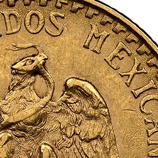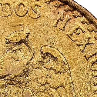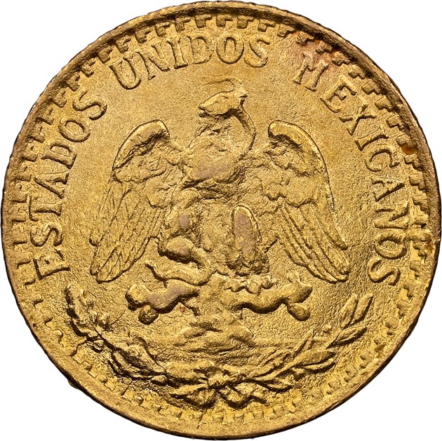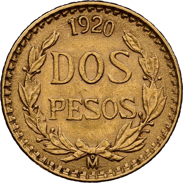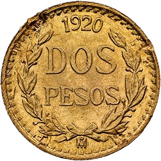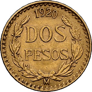 一個多世紀前,在墨西哥革命結束後,墨西哥曾鑄造多種面額的金幣,其中面額最小的是2比索。其直徑比10美分硬幣還要小,僅為13毫米,含金量約為1/20盎司。凡是碰到號稱是此類別硬幣的藏品,藏家都應對其幣面細節和重量進行細緻檢查。