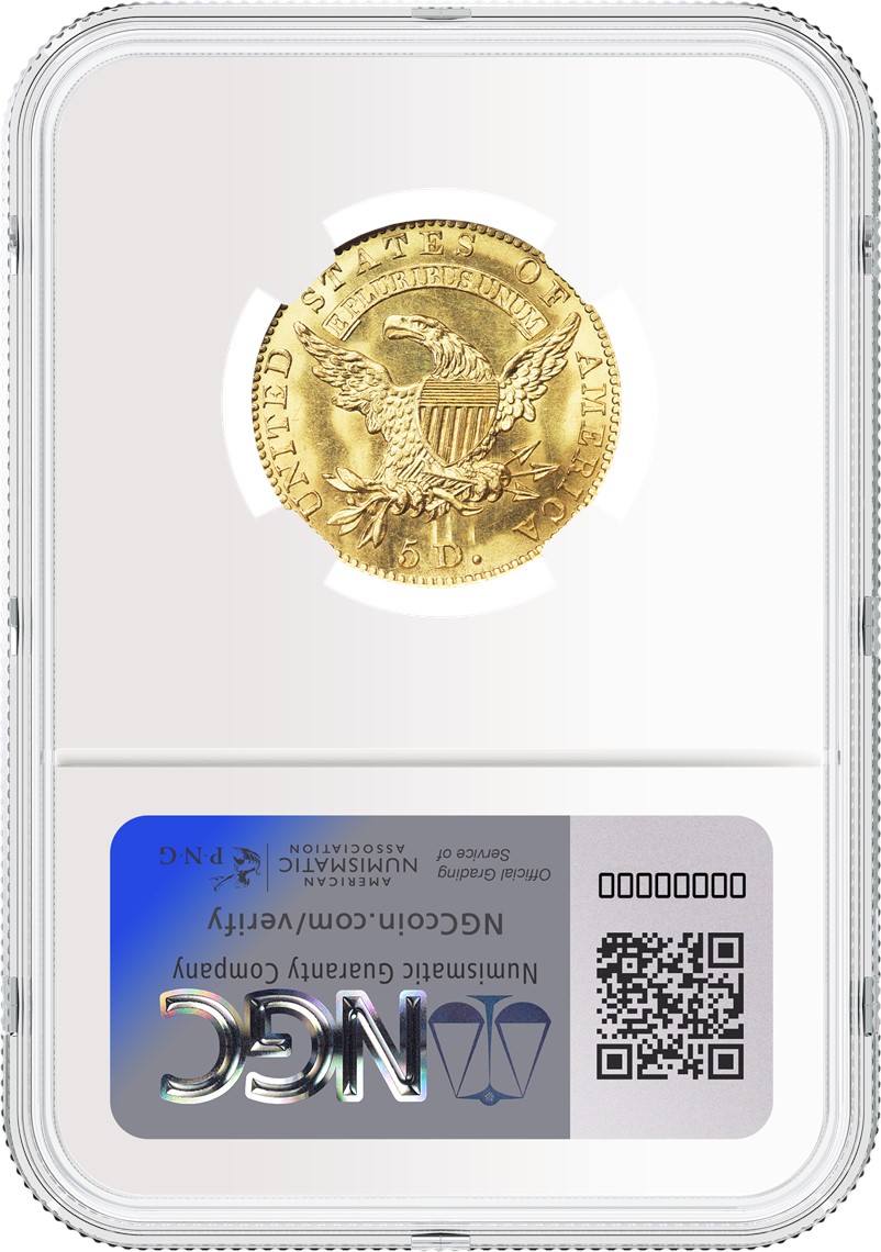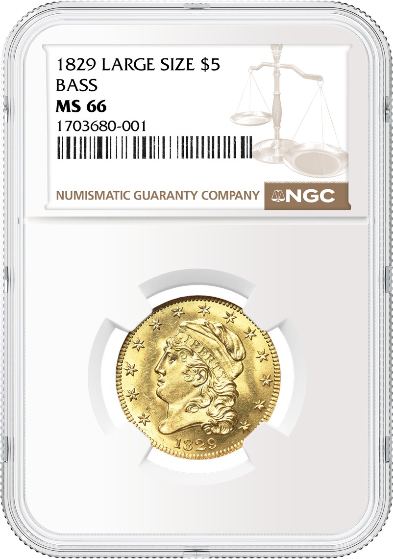 另一枚取得矚目成交價的NGC評級幣是出自Bass舊藏(Bass Collection)的1829年大尺寸版5美元鷹洋金幣,其評級等級為NGC MS 66(拍品號3240),成交價為100.65萬美元。此版別硬幣是美國早期金幣中具有里程碑意義的珍稀品之一,據信目前僅存世7枚且其中5枚為流通鑄幣,其稀有度可見一斑。