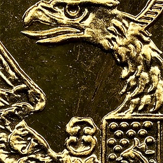 轉至背面,贗品的破綻同樣突出。真品盾徽內的圓點規整飽滿、層次清晰,贗品則是輪廓含混、刻畫扁平。除此之外,贗品其餘的圖案細節也缺乏立體感,工藝水準堪憂。尤為顯眼的是,左側鷹首下方的幣面有一處突兀的凸起,直接破壞了幣面完整性。如此粗陋的做工與原版錢幣的精湛工藝截然不同,顯然是造假者製作過程中敷衍了事的直接體現。