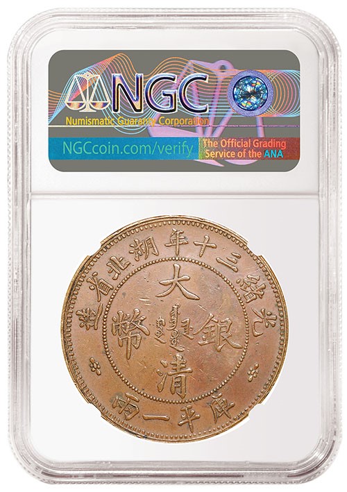 - 1904年(光緒三十年)湖北省造大清銀幣庫平一兩紅銅樣幣,評級等級為NGC AU 50 BN