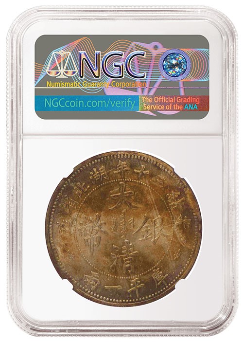 - 1904年(光緒三十年)湖北省造大清銀幣庫平一兩黃銅樣幣,評級等級為NGC MS 64
